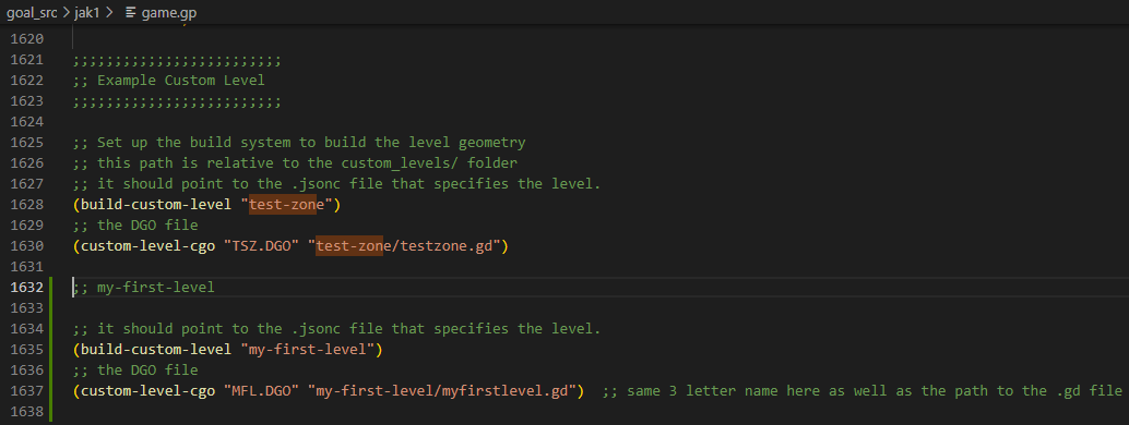 The .gd file, myfirstlevel.gd in my situation, will create the definition for our DGO file, AKA our full level file. In short, we'll have to put everything that needs to be included inside of our level here.
