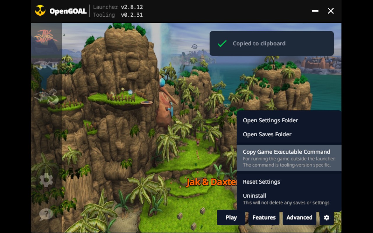 gk.exeto open the gamegkdefaults to booting Jak 1. If you're trying to play Jak 2 or 3, you'll need to open Powershell/Command Prompt and run./gk.exe --game jak2or./gk.exe --game jak3.