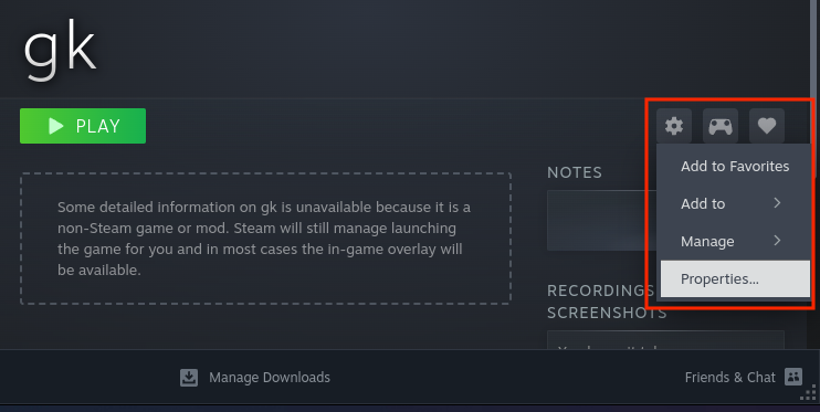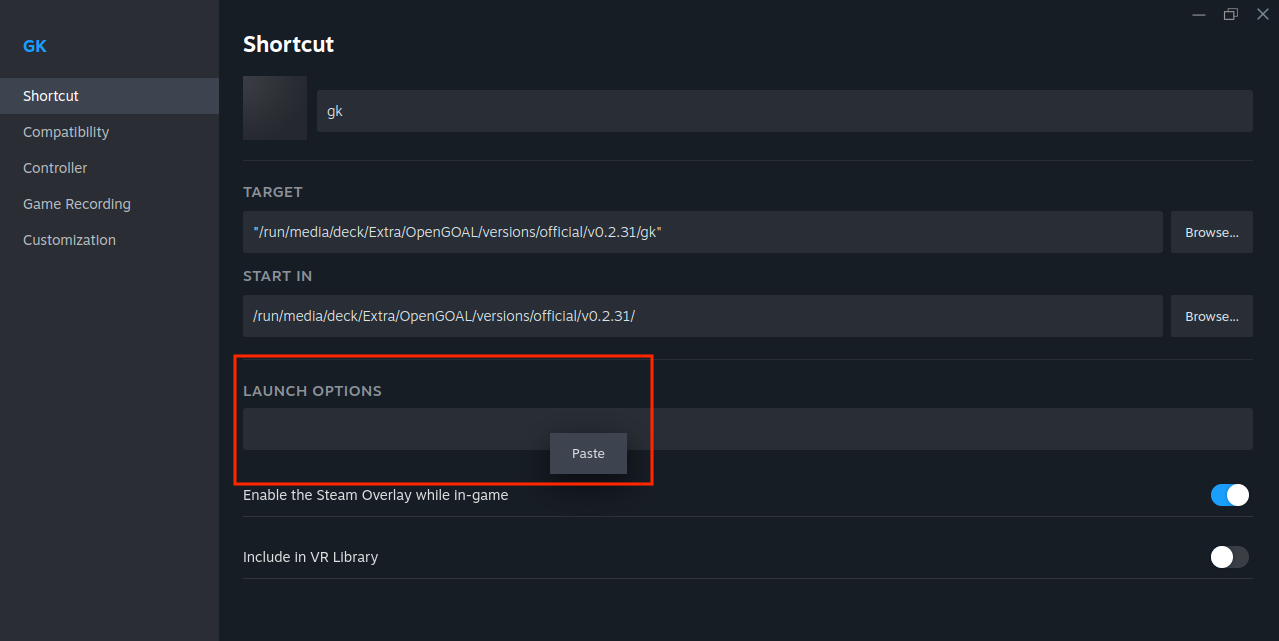 Now we can open the shortcut's properties to paste in the command the launcher provided us into the Launch Options input