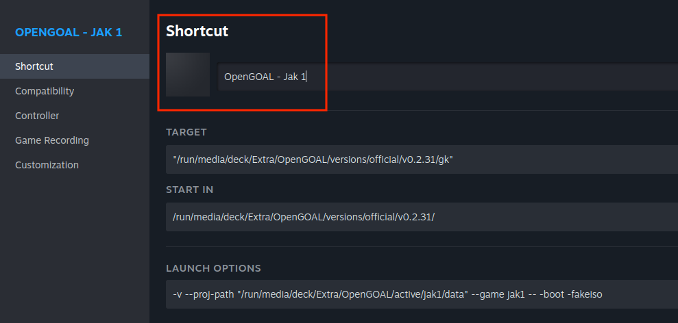 A simple shortcut like this will only work for launching Jak 1, you will need to specify the arguments as described in the previous Linux section for Jak 2 and beyond.